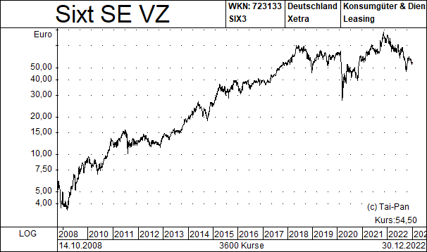 Unser längstes Investment überhaupt ist die Sixt-Aktie. Seit dem 14.10.2008, also seit mehr als 14 Jahren, halten wir die Anteile des Autovermieters bereits im Musterdepot – und das mit durchschlagendem Erfolg. Bei einem kleinem Teilverkauf im November 2019, mit dem wir die starke Übergewichtung der Aktie etwas abgebaut haben, wurde eine Rendite von 1.076 % realisiert. Das zeigt exemplarisch, wie sehr sich langfristiges Investieren lohnen kann, so lange die Value-Kriterien erfüllt sind. Und das war und ist bei Sixt der Fall. Nicht nur, dass der Markt der Autovermietung stetig wächst, darüber hinaus bauen die Pullacher ihr Filialnetz rund um den Globus sukzessive weiter aus. Und obwohl die Konkurrenz hart ist, wächst Sixt als einziges großes Familienunternehmen der Branche dank überdurchschnittlicher Eigenkapitalquote und hohem Spürsinn für Marktentwicklungen deutlich schneller und profitabler als die Wettbewerber. So hat Sixt von 2005 bis 2019 seinen operativen Umsatz fast verdreifacht und seinen Nettogewinn sogar nahezu verfünffacht, was den wesentlichen Treibsatz für die fulminante Kursentwicklung darstellte. Und auch die Corona-Pandemie konnte diesen Trend nur temporär unterbrechen, denn schon 2021 und 2022 schrieb Sixt wieder neue Rekordzahlen, die über dem Vor-Krisen-Niveau liegen.